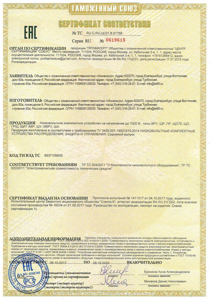 Производство электрощитового оборудования регламентируется Государственными стандартами. ООО «Инжениум» производит различные виды НКУ (Низковольтных комплексных устройств) в соответствии с требованиями технического регламента Таможенного союза ТР ТС 004/2011 «О безопасности низковольтного оборудования».